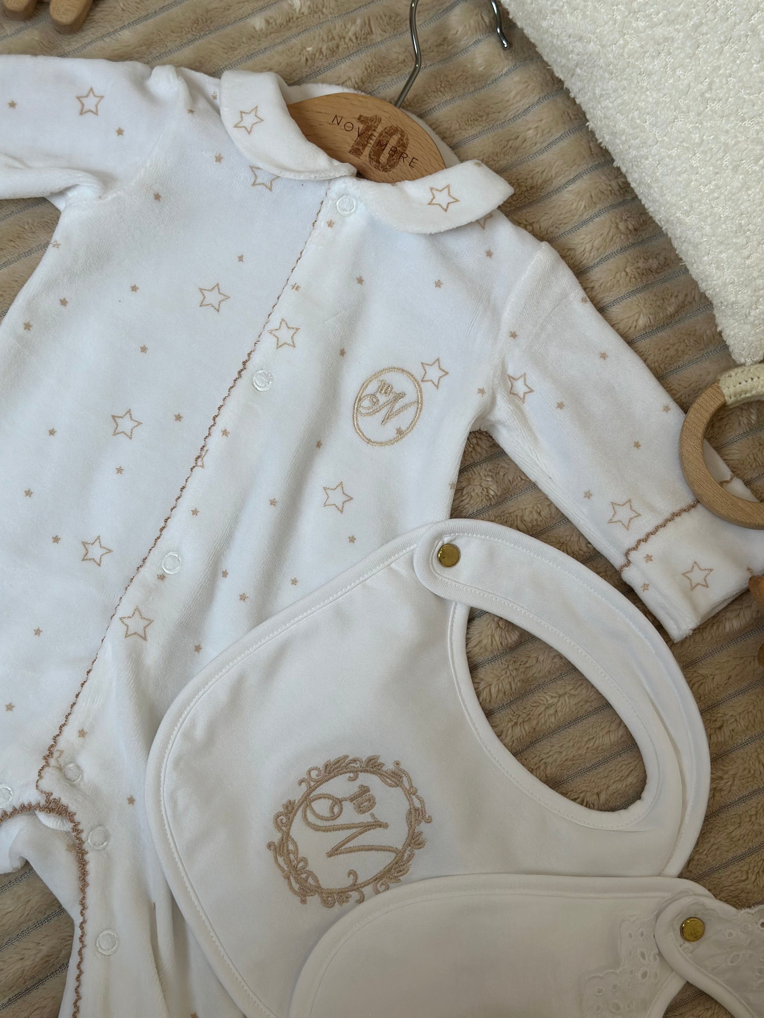 Deux modèles empreints de douceur, délicatement brodés, pour accompagner les premiers instants et les plus jolis sourires.
